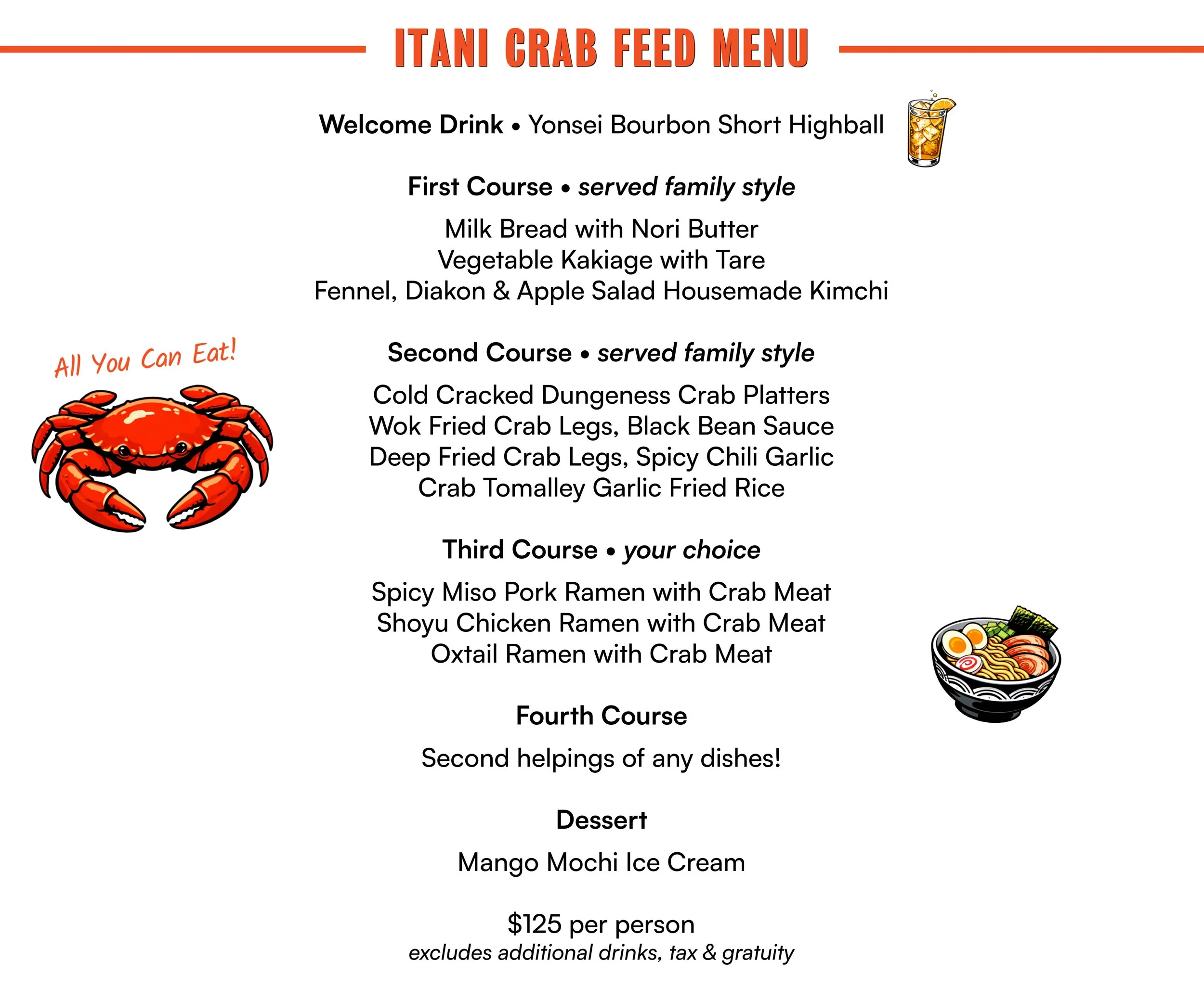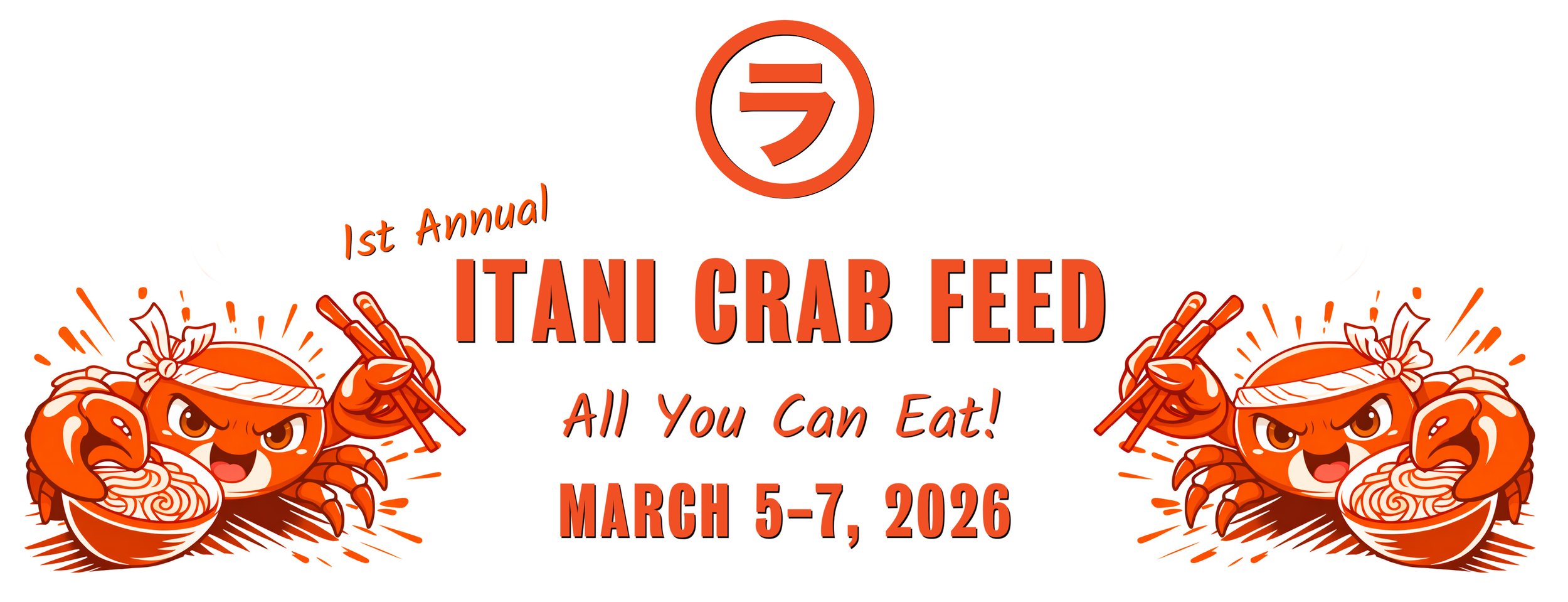 You’re invited to our 1st Annual ITANI Crab Feed! For three evenings in a row, Thursday, March 5 - Saturday, March 7, Chef Kyle Itani will prepare an all you can eat five-course menu featuring the season’s best Dungeness Crab in various preparations. These communal dinners will be hosted in our Genki Room at the back of Itani Ramen. Get a group together or come solo to make new friends at these fun & delicious dinners!